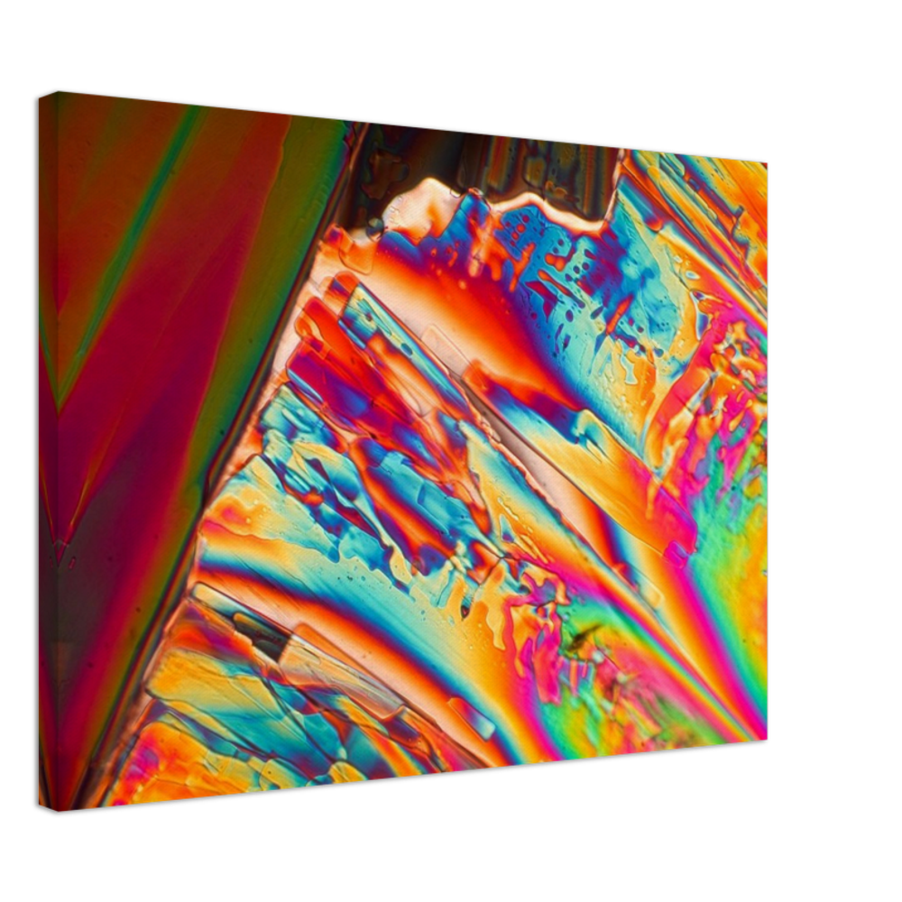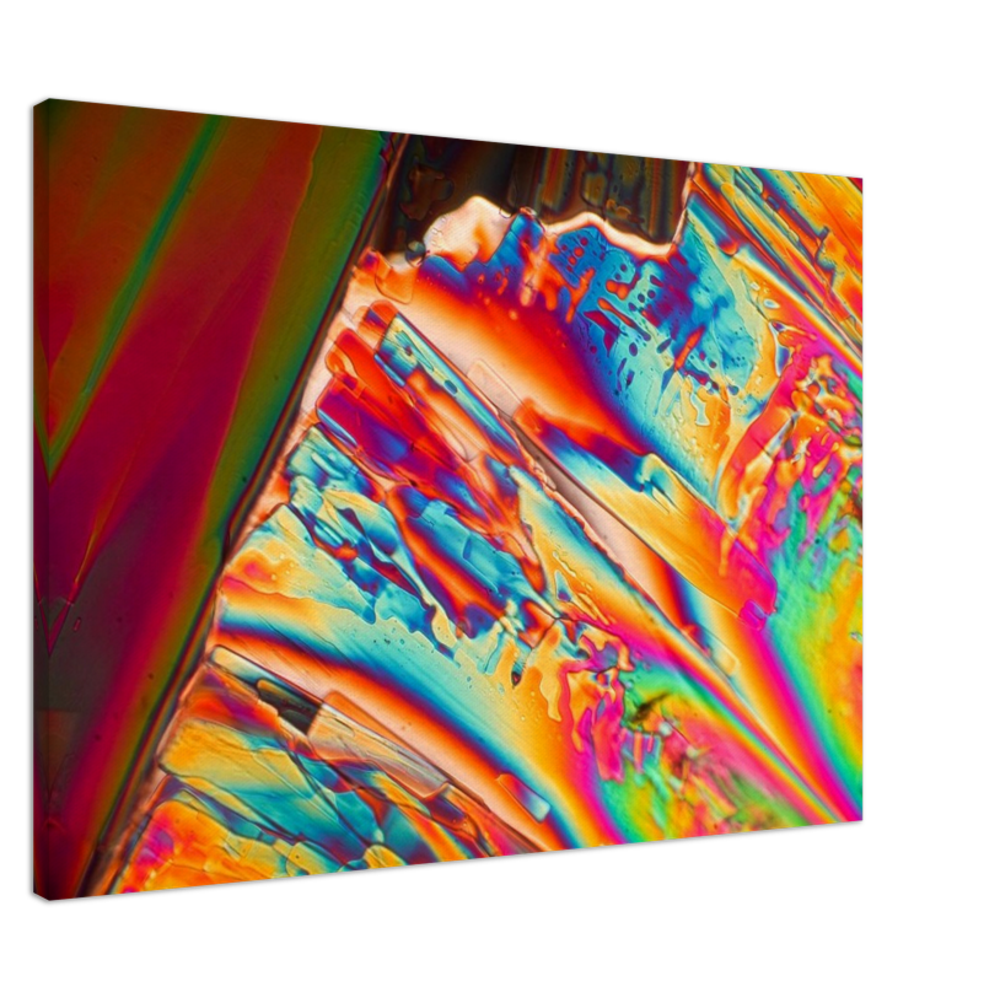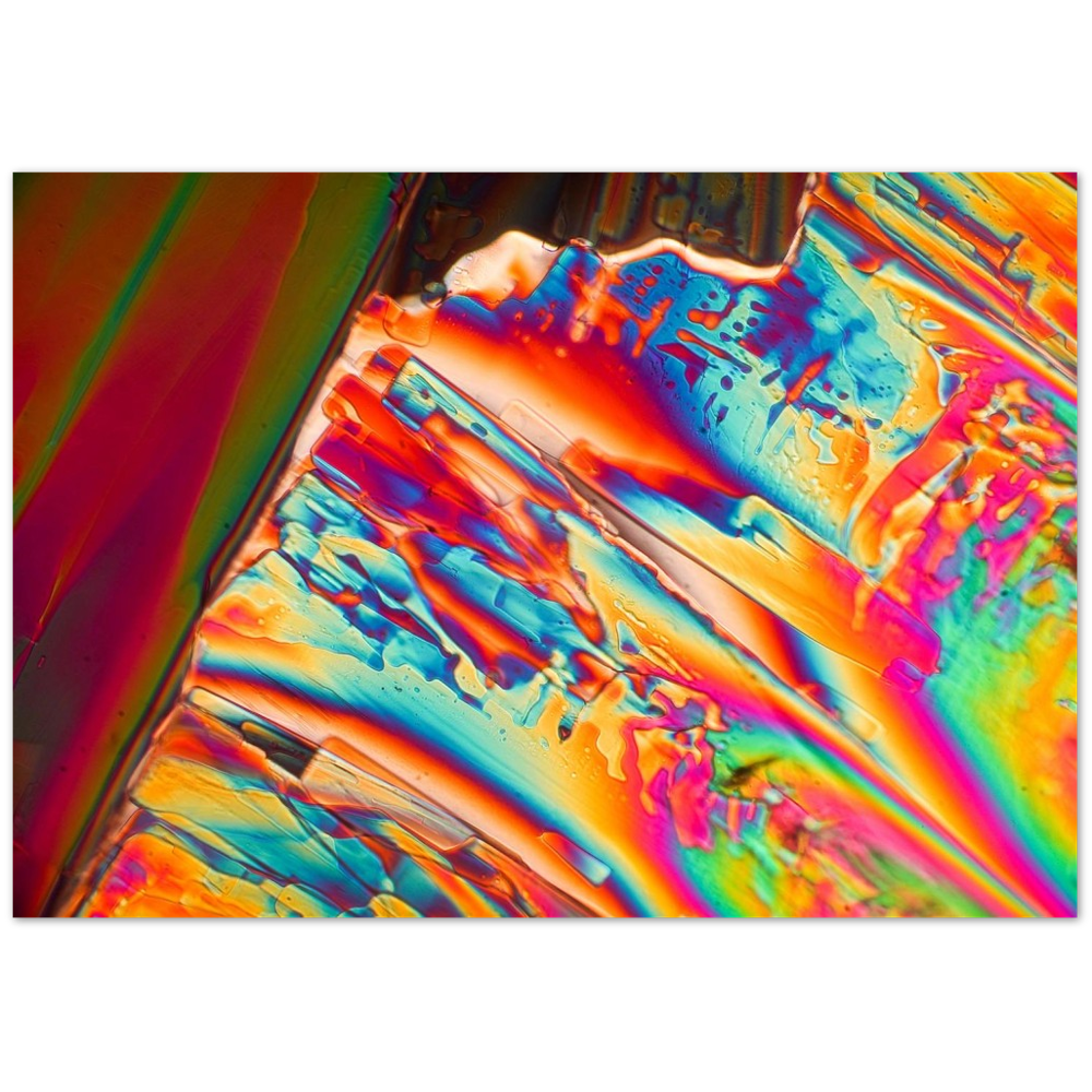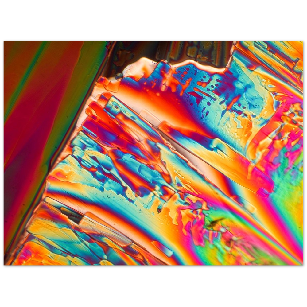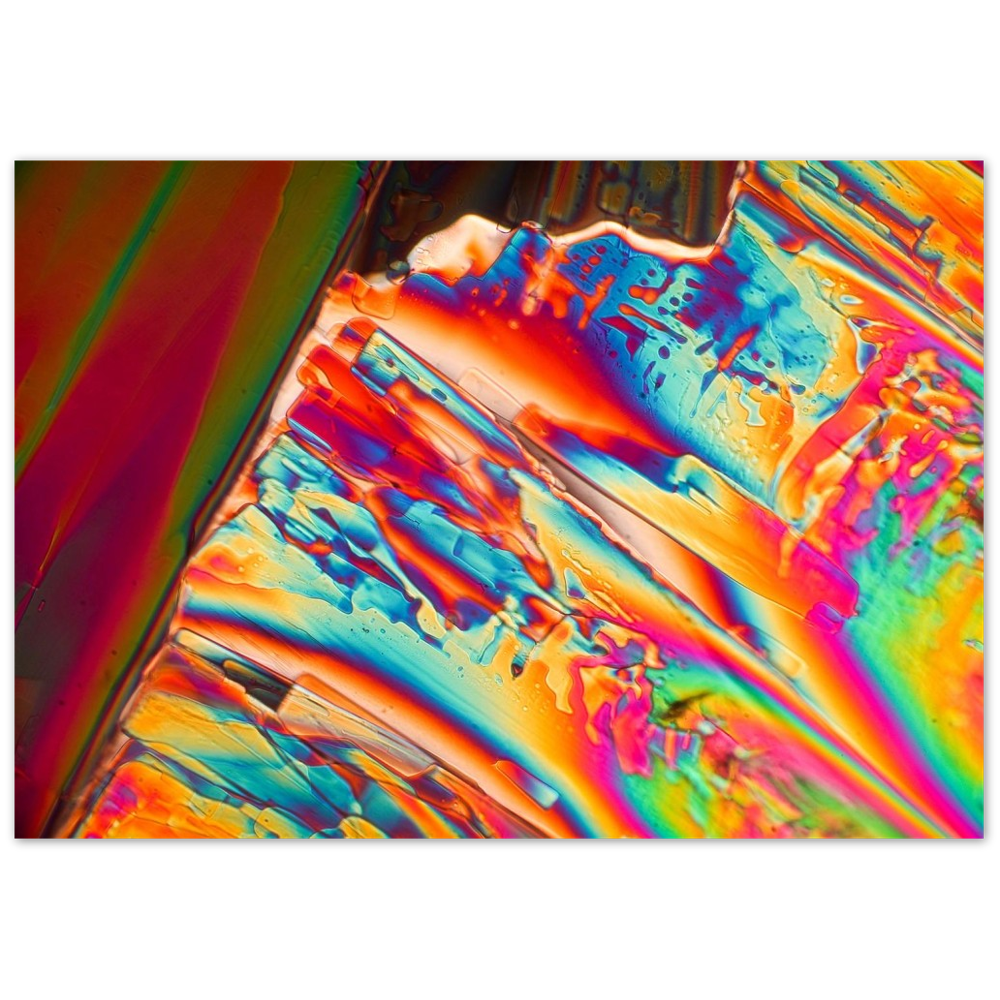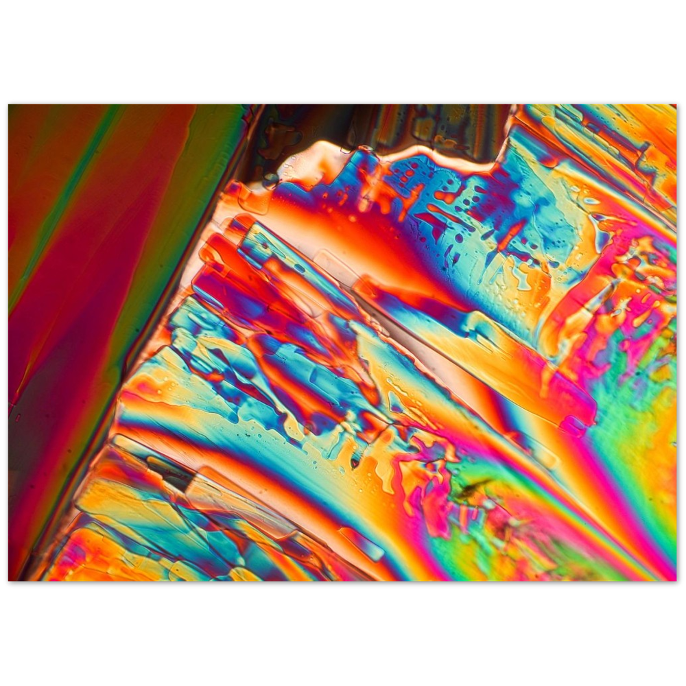 Para-Dichlorbenzol ist eine Substanz, die aus einer gesättigten Lösung in sehr schönen rechteckigen Tafeln kristallisiert. Die Kristalle zerfallen allerdings nach kurzer Zeit, da die Substanz verdunstet. Sie eignet sich zur Geruchsneutralisation und wurde früher zu Mottenkugeln verarbeitet. Hier ist ein Stadium gezeigt, in dem die Kristallformen nur noch als Schlieren erkennbar sind, weil sie weitgehend in Chaos übergegangen sind. Aber im Polarisationsmikroskop zeigt die Masse noch die strahlenden Farben der Doppelbrechung.